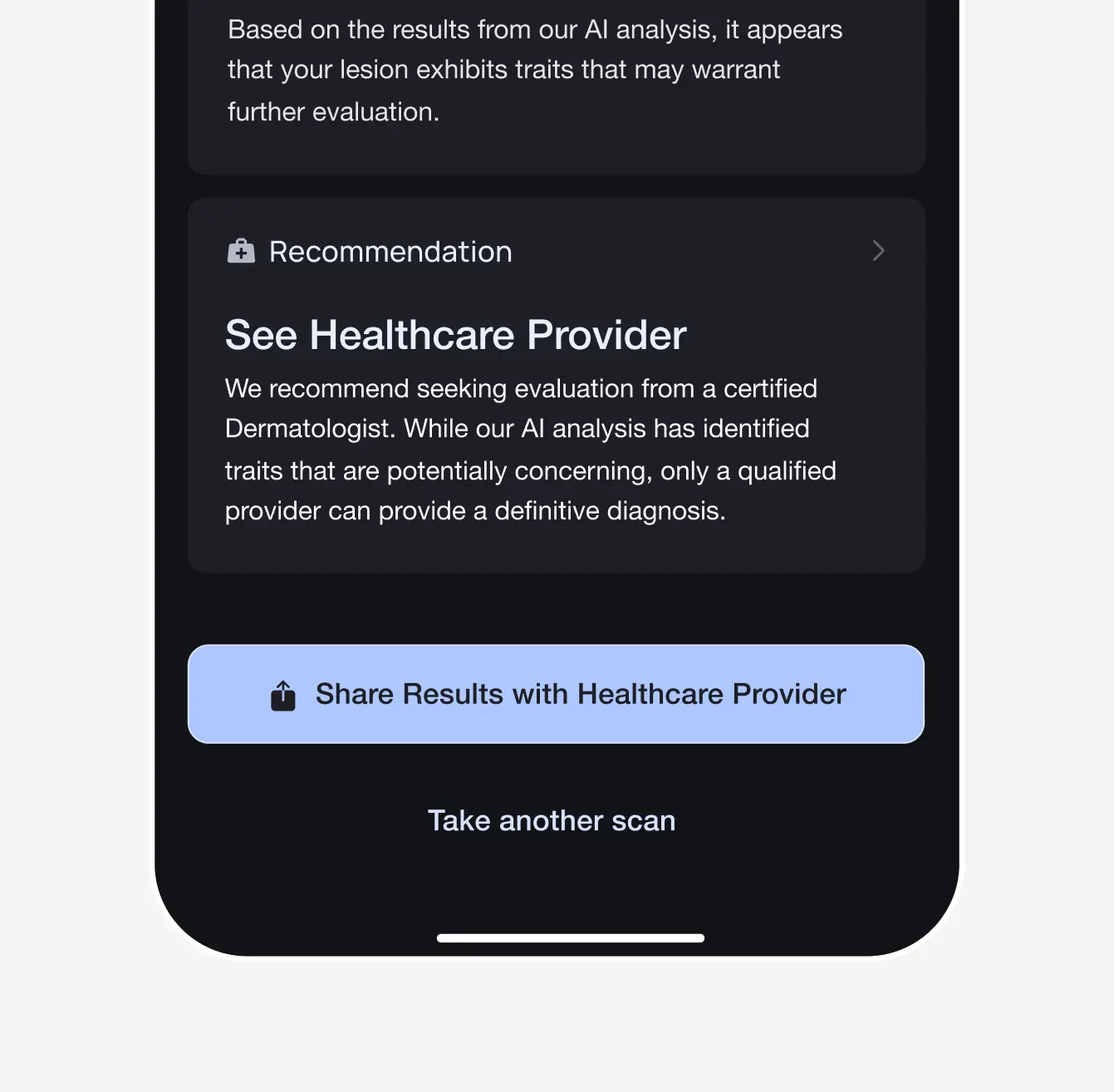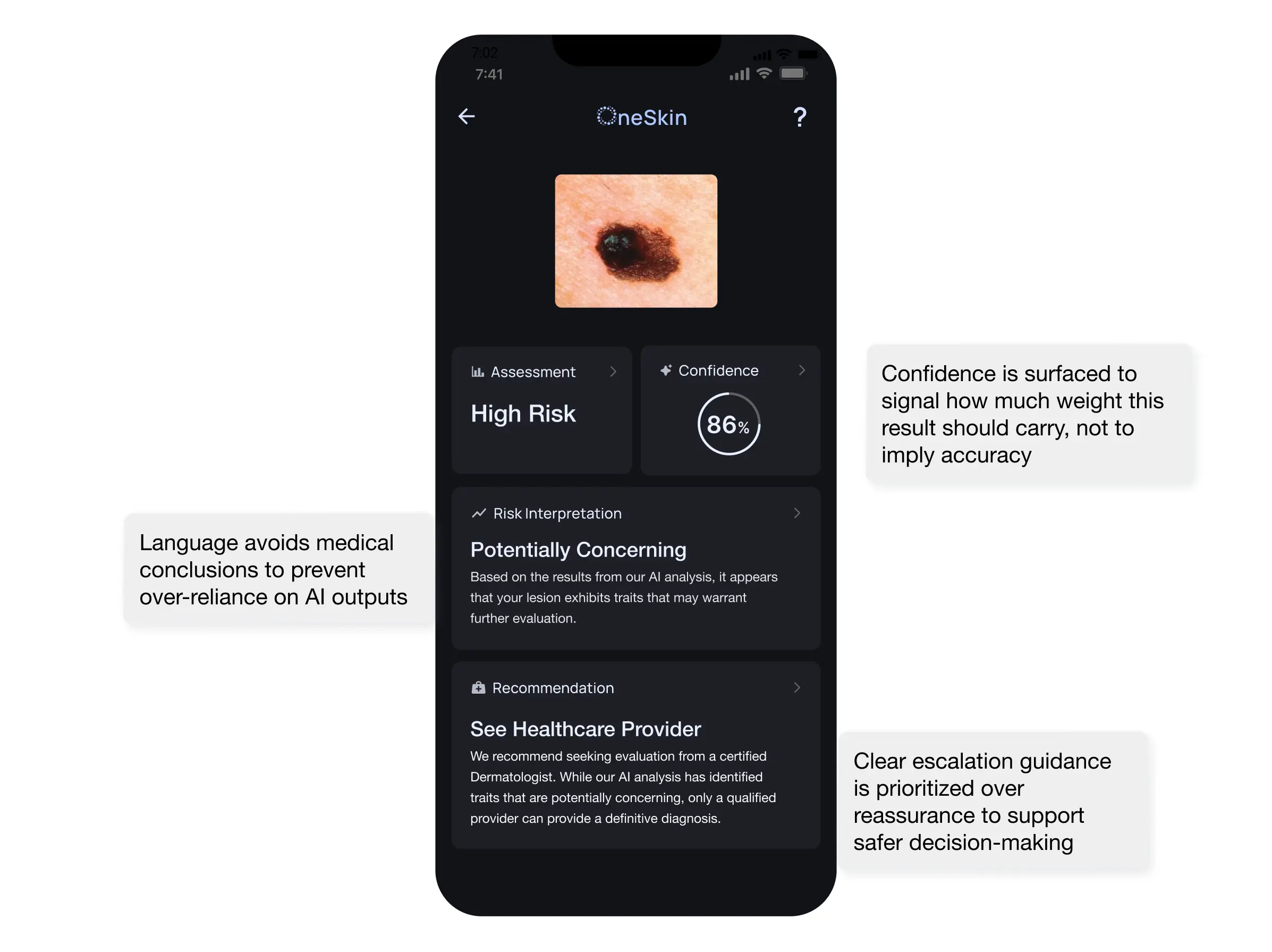 Conversations with two PCPs and two dermatologists showed that the core issue in skin cancer triage isn’t detection, it’s what to do when certainty is low. This shifted the product from an AI detection tool to a decision-support system.