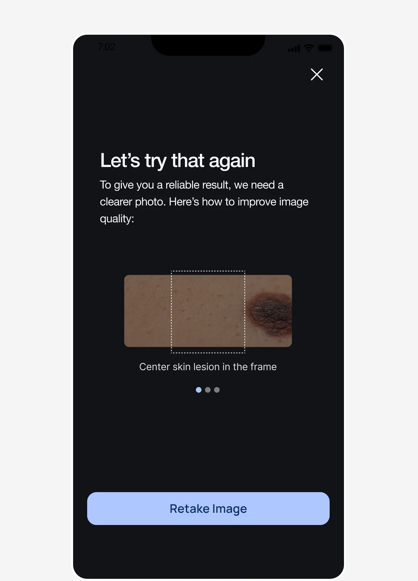 A patient-facing experience that standardizes lesion image capture, communicates conservative risk signals, and supports virtual triage, without presenting diagnoses or false reassurance